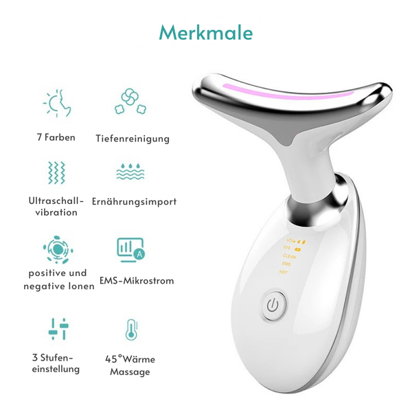 Unser LED-Massagegerät bekämpft effektiv Zeichen der Hautalterung. Die Kombination aus Mikrostrom und Lichttherapie erneuert die Haut und sorgt für ein strahlendes Aussehen.